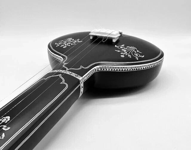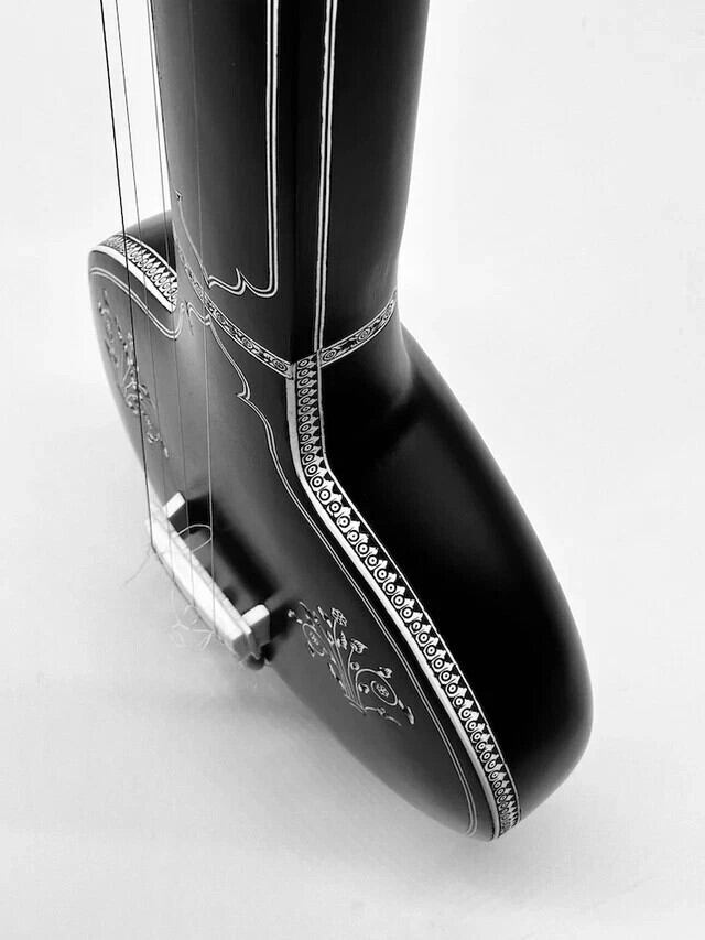 インド古典音楽や瞑想、ヨーガの伴奏に最適な、持ち運びに便利なフラットタイプのタンプーラです。モダンなマットブラックの仕上げに、ホワイトの装飾が映える美しいデザインが特徴です。