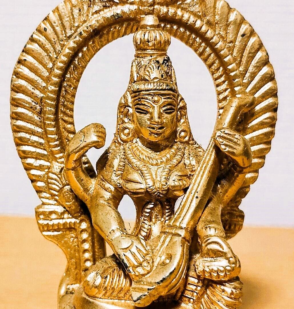 金属製の美しいサラスヴァティ女神像です。精巧な彫刻が施されており、ゴールドメッキで装飾されています。楽器を持つ姿が特徴的で、宗教的な装飾品としても最適です。
